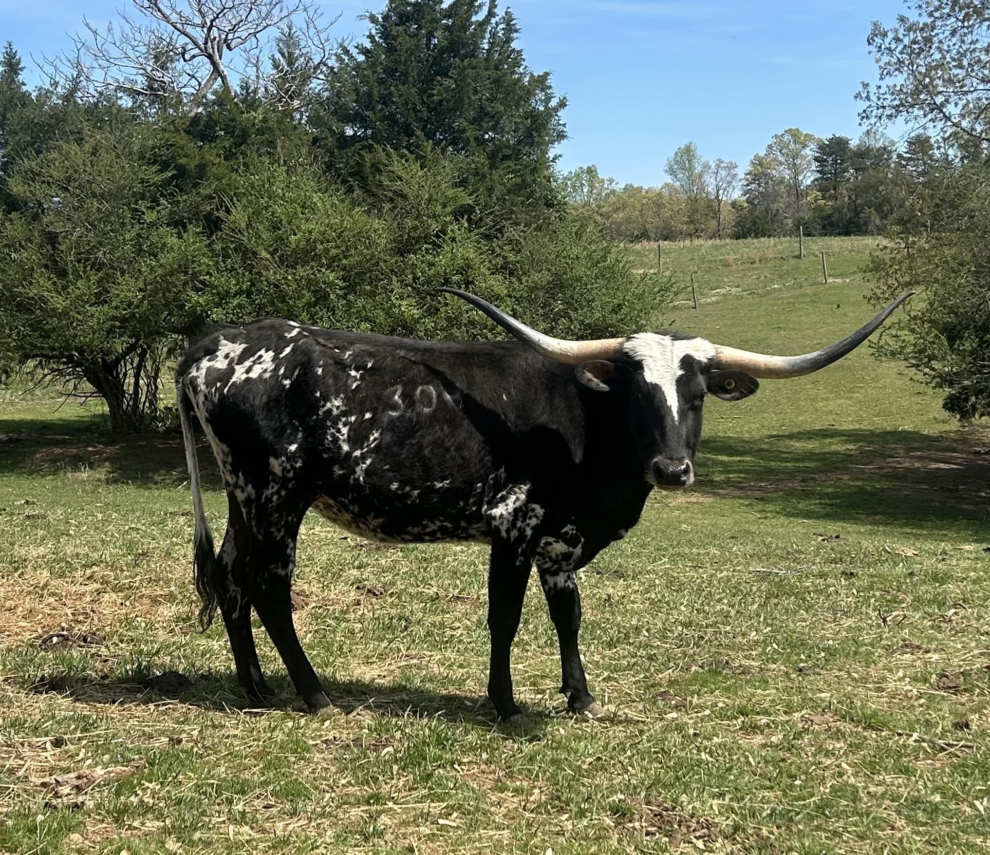 Beautiful Parker brown & white heifer out of the great Scott Hughes breeding program. Her dam is the twisty horned Spicette 128 and her sire is Brazos Julio 759. What a great combination of genetics! This girl is on her way to twist up just like her momma!