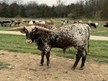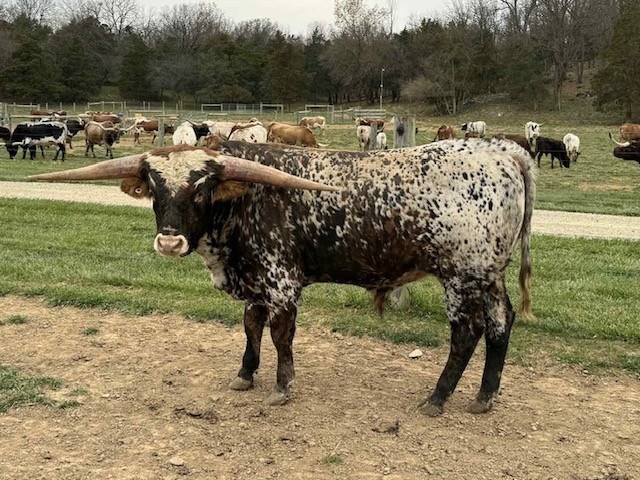We are very excited about this bull and we love his pedigree. He has a large frame, nice hip, some serious horn and a little color to boot. We can't wait to see what he does with our girls.